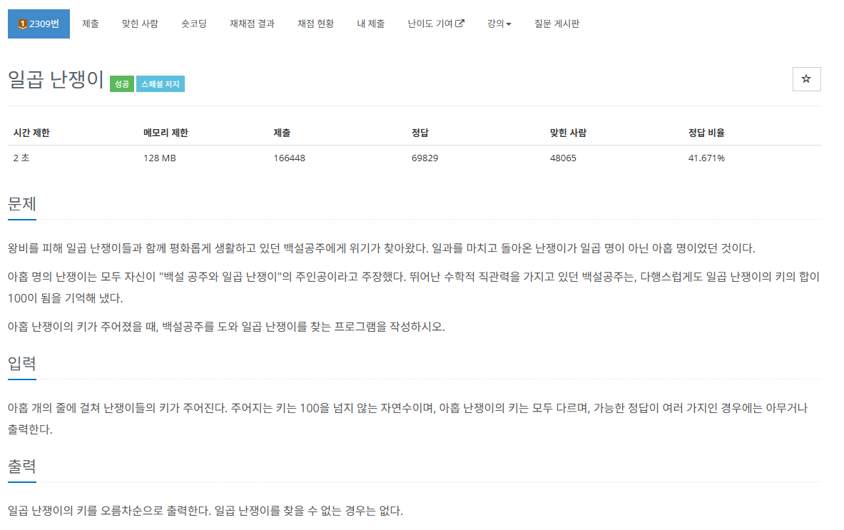 7명의 난쟁이 합이 100이 되는 경우를 찾고 하나씩 출력하는 문제이며,